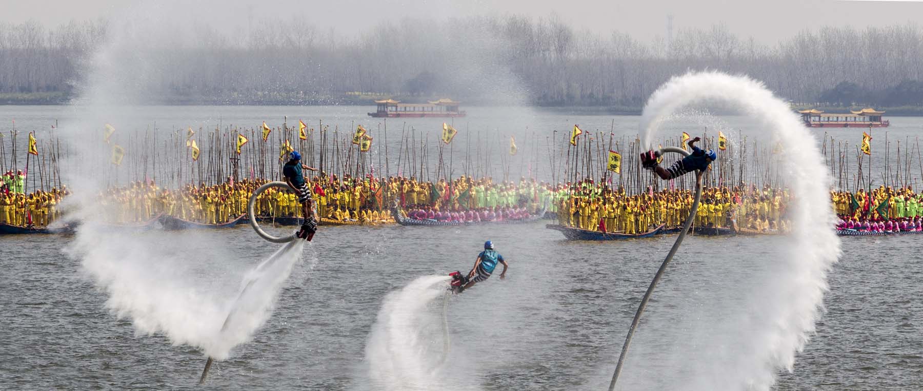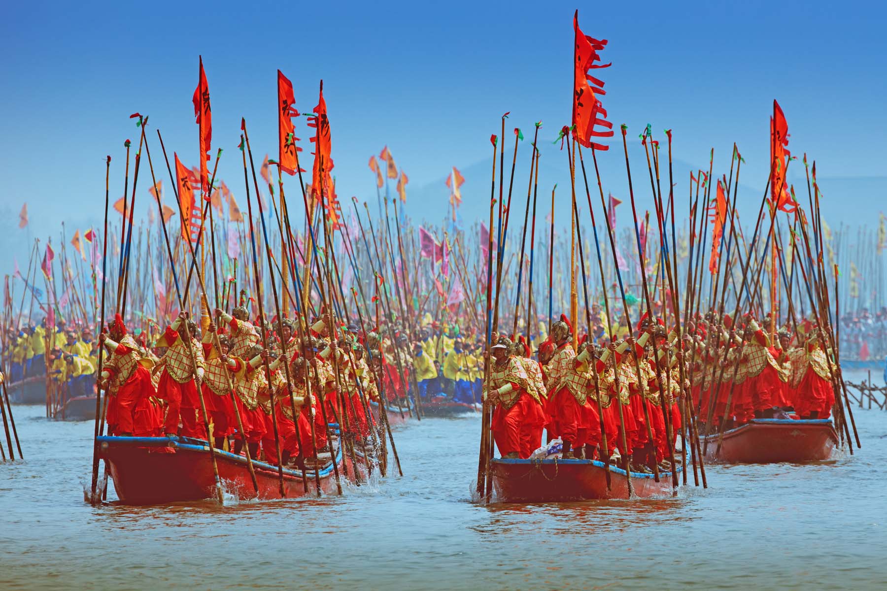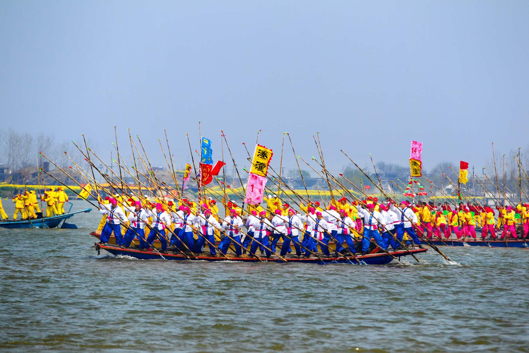会船入场式结束后,湖面上所有的船只,千篙齐动,万桨争划,喊声震天,激荡云水,溱湖,汇成一片欢乐的海洋……