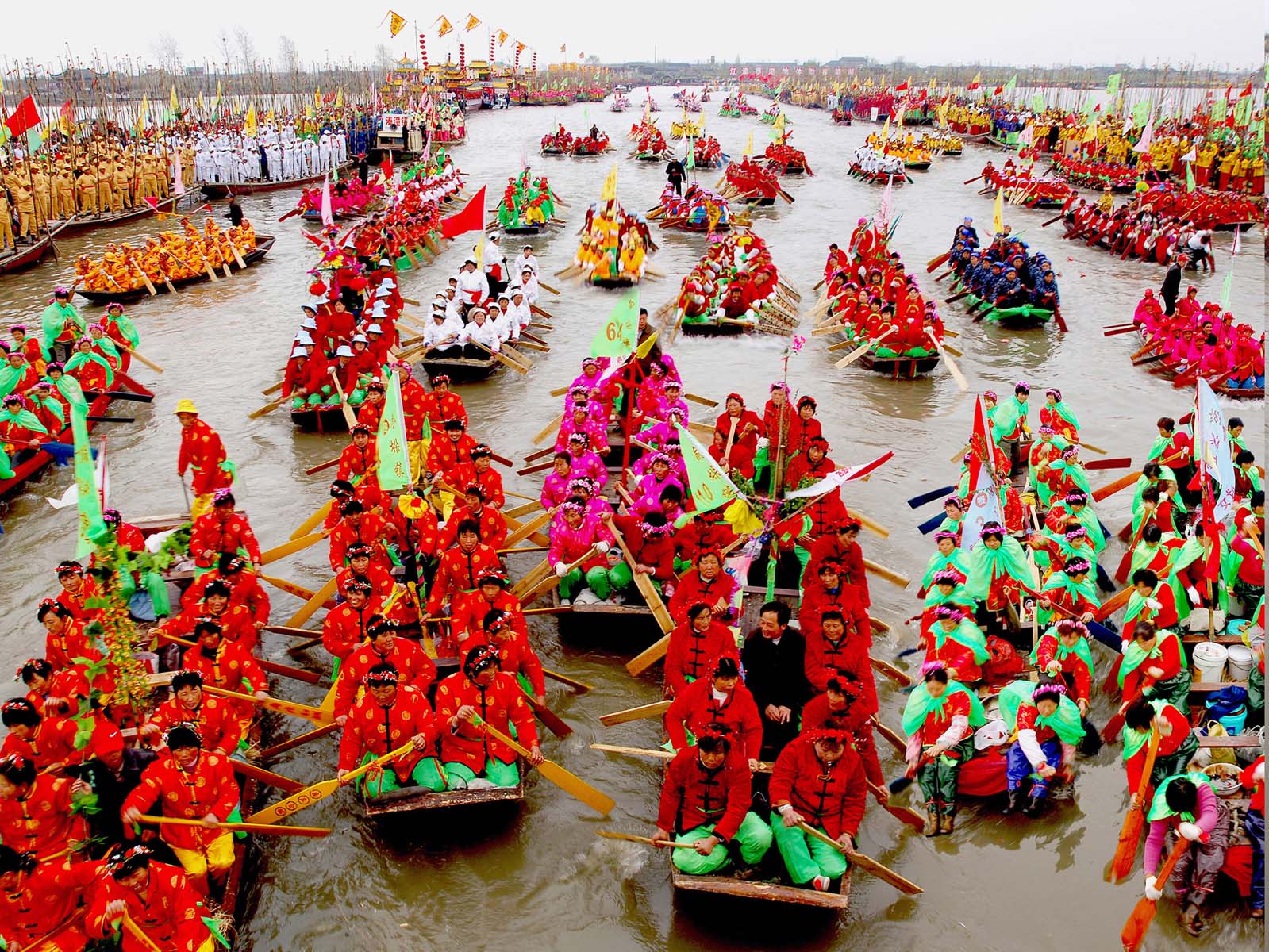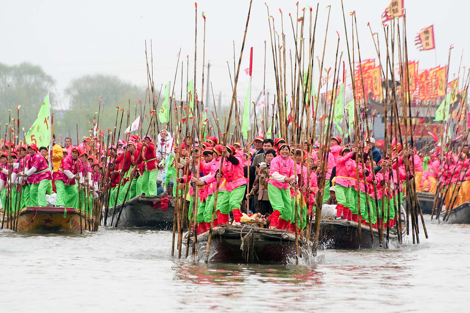贡船过去之后,篙船、划船交替登场,以编队形式齐头并进,呐喊向前。篙子船长篙激浪,呼啸而行,划子船五彩缤纷,轻盈如飞。篙船、划船之后,一条条龙船又击浪而来,船上各色各样的龙不停舞动,形成翻滚的龙带,腾飞于溱湖之上,腾飞于云水之间。与此同时,在湖中间的赛道上数十艘篙子船开始进行比赛,篙手们你追我赶,相互比拼,篙歌猛进。
