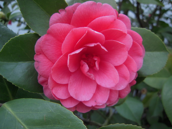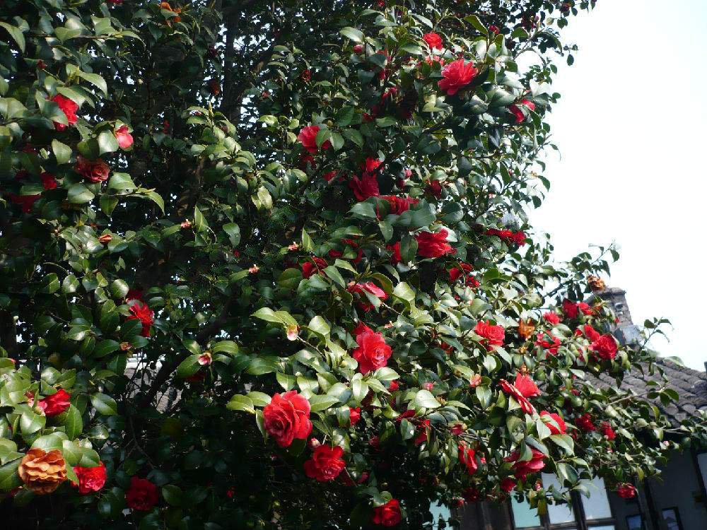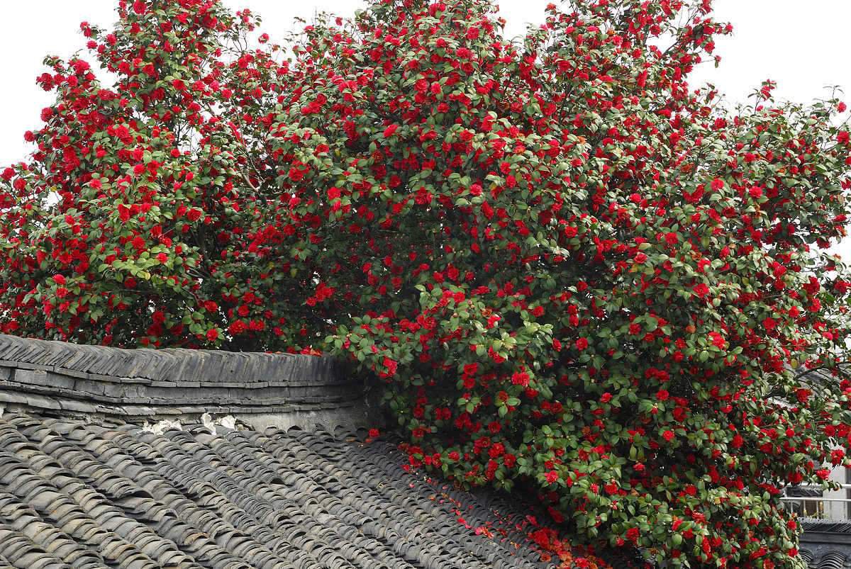谈姿色,溱潼古山茶树倚墙而生,树干壮实岸然,皮纹黝黑细腻,枝叶茂盛。 每年清明时节,开花万朵,团团簇簇,鲜亮火红,争奇斗艳。